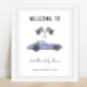Cartão de convite para chá de fraldas do tema Race car com ilustrações de aquarela de um carro vintage roxo (violeta) e de preto - branco. "Corrida para um chá de fraldas."