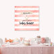 Um fundo de riscas brancas e cor-de-rosa bonito para celebrar um chá de fraldas temático de uma menina. Tan bunny aparece logo acima do nome de honoree como um modelo. Pequenos bordos de prata e estrelas douradas se sobrepõem à borda superior, como confetti caindo. O texto "Bem-vindo" está em uma faixa de bronzeado.