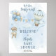 Design de "Boas-vindas" Chá de fraldas com um ursinho de pelúcia com uma gravata de arco azul pendurada num monte de balões de um lado com um carregando de balão de ar um buquê floral do lado direito. Bandeiras de reposição pendura entre os dois balões. Nuvens e estrelas num fundo de aquarela azul ao redor do design. Design composto por Designs Holiday Hearts.