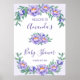 Este poster chá de fraldas apresenta flores de aquarela roxas. Personalize-o com um nome e uma data. Este poster faz parte de uma coleção que apresenta uma faixa de cheios de produtos de chá de fraldas correspondentes.