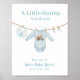 Tema do chá de fraldas de páscoa com ilustração inspirada em vintage de um traje de Páscoa com carrinho de coelho de Páscoa e coelho de Páscoa, ovelha de Páscoa e meias de bebês com cenouras penduradas na linha de roupas. Esquema de cor azul.