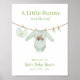 Tema do chá de fraldas de páscoa com ilustração inspirada em vintage de um traje de Páscoa com carrinho de coelho de Páscoa e coelho de Páscoa, ovelha de Páscoa e meias de bebês com cenouras penduradas na linha de roupas. Esquema de cor verde.