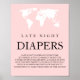 Você está hospedando um chá de fraldas temático de viagem? Se a sua resposta é sim, então é para si! Sinal bonito de "fralda noturna tardia" que corresponde ao tema do chá de fraldas. Confira o resto da coleção para fazer correspondência com convites de passaporte, decoração por viagem e jogos de chá de fraldas. Temos 7 cores pastéis: azul, rosa, roxo, verde, amarelo, laranja e bege. Você encontrará um par perfeito para uma menina, um garoto ou um chá de fraldas neutro em gênero.