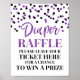 Sinal de rifa de fralda para chá de fraldas em um padrão de confete roxo e preto.