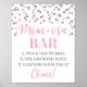 Poster de sinal de bar Momosa para chá de fraldas em padrão de confete branco, rosa e prateado com letra de estilo manuscrita. Perfeito para chás de fraldas e aspersão de bebês.