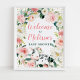Esta bela placa de boas-vindas chá de fraldas de vaca mostra uma coroa verde-aquática com flores rosa e brancas, faux gold foil confetti e uma ilustração de vaca fofa. Adicione facilmente suas informações usando os campos de modelo on-line.