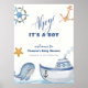 Tema do chá de fraldas náutico, Ahoy! É um chá de fraldas de menino, comemore o chá de fraldas que vem com nosso marinho azul giro e giro, náutico, veleiro, estrela do mar, baleia oceânica, roda em cor bege, fundos com padrão de listras. Você pode personalizar seu próprio texto e cor através de "personalizar este design".