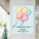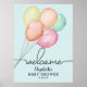 Balões de multicores e aquarelas em azul são um design divertido para um chá de fraldas-menino, seus detalhes junto com a palavra "Bem-vindo" são apresentados no topo deste poster. ALTERE O TAMANHO para ajustado do evento. CORRESPONDENTE a itens na nossa coleção.