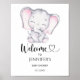 Poster de Boas-vindas do Chá de fraldas Elefante Rosa. Visualize o link de coleção nesta página para ver todos os itens correspondentes nesta bela design.