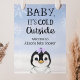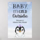 Bem-vindos convidados ao seu chá de fraldas com este adorável poster, com um pinguim bonitinho, fundo de neve e texto "bebê está frio lá fora" Adicione o nome do convidado de honra, a data do chá e o texto de boas-vindas personalizado usando os campos fornecidos.