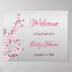 Uma cereja rosa bonito floresce e um texto de boas-vindas de chá de fraldas personalizado em um fundo de cinza. Poster de acolhimento bonito para o seu chá de fraldas.