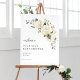 Bem-vindo a convidados para o seu evento com este sinal de boas-vindas personalizável ao chá de fraldas. Apresenta buquê floral de cor d'água de rosas brancas e hidrangeas com sotaques verdes. Personalize adicionando os detalhes do evento. Este sinal floral de boas-vindas é perfeito para chás de fraldas de primavera e inverno. Itens correspondentes estão disponíveis.