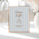 "Podemos esperar" Comemore a mãe a ser com este bonitinho cartaz de fralda desenhado à mão, com um desenho de uma linha colorida de um ursinho de peluche e um fundo listrado vertical e azul macio.