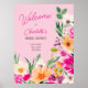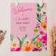 Bem-vindos aos seus hóspedes em estilo com a nossa ilustração Elegante, brilhante e ousada das flores primavera de verão, com bonito símbolo de chá de panela de flores e pincéis selvagens de grande porte, com uma tipografia caligráfica moderna, com flores brilhantes, cor-de-rosa-neon, laranja, verde e amarela, em cor-de-rosa retrógrado.