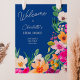 Bem-vindos aos seus hóspedes em estilo com a nossa ilustração Elegante brilhante e ousada das flores primavera de Verão, com bonito flor selvagem e roleta de pincel, com uma tipografia moderna da caligrafia, com néon brilhante, cor-de-rosa, laranja, verde e amarela, em azul