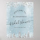 É hora de comemorar seu tema de chá de panela de boas-vindas no inverno com este luxo flocos de neve com brilho prateado faíscas e floresta de pinheiro com relva prateada sobre um elegante fundo metálico azul-gelo festivo festivo, com uma tipografia moderna e legal.