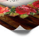 design de chá de panela com jarro de Mason e conjunto de rosas e flores coloridas em forma de coroa, numa imagem de fundo da prancha de madeira castanha escura. Um tema de verão ao ar livre rústico para um chá de panela de tema de país ou cabine. Conselhos de madeira marrom-escura, ricos em madeira, provenientes de uma vedação antiga ou de painéis de flutuação, contrastam com o belo gráfico floral bonito. © CustomInvitesOnline.com