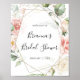 Este poster de boas-vindas com chá de panela de folhagem verde-ouro geométrico é perfeito para um chá de casamento moderno. O design apresenta uma folhagem botânica, pintada à mão, verde e dourada, com flores cor-de-rosa, pinceladas, brancas, enfeitando uma elegante estrutura geométrica.