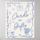 Anuncie a área designada para cartas e presentes com nosso charmoso cartão azul-retrógrado e Poster de presentes! Este delicioso cartaz apresenta um design retrorinspirado, adornada com elementos caprichosos como balões, câmeras, corações e um adorável buquê de flores em um vaso. Enquadrada por uma fita de ondas gigante, este sinal adiciona um toque de elegância vintage ao seu decor de chá de panela. Com cores personalizáveis e uma fonte escrita à mão, ele orienta os convidados sem esforço para o lugar perfeito para deixar seus desejos e presentes. Que este sinal seja um encantador aditamento à sua celebração, assegurando que todos os presentes sejam recebidos com amor e gratidão!