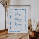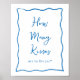 Este belo design de inspiração italiana apresenta uma letra cursiva estilo manuscrito verde acentuada com uma borda de fita escrivável em azul para um olhar na Costa Amalfi no verão. Este elegante sinal de jogo de adivinhação do chá de panela mediterrânico apresenta a frase "quantos beijos há no frasco?" Pronto para enquadrar; escolha impressão e envio profissionais ou a opção de download instantâneo para impressão local ou em casa. Par com nossos cartões de jogo de adivinhação de chocolate.