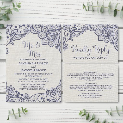 Burlap and Navy Lace Wedding Invitation SuiteCriado por Miriam Kokolo