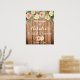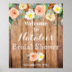 Personalize este sinal de chá de panela de madeira rústico para ter seu próprio texto. O fundo médio de madeira marrom tem um entalhe floral no topo em rosas de marfim, branco, laranja e pêssego com folhas verdes. O escrevendo está em branco e tem duas flores separadas entre as linhas do texto e a data do evento.