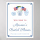 Flores clássicas em azul e branco e bandeiras dos EUA em um vaso de jarra de gengibre decoram este design de placa de boas-vindas de festa. Mostrado aqui para um chá de noiva, mas todo o texto pode ser personalizado de acordo com as suas necessidades. Com relação à borda da Chave Grega, você pode alterar a cor dela alterando a cor do fundo do design (entre no ferramenta de design clicando / tocando para personalizar ainda mais). Se você precisar do pôster em outra proporção de tamanho (não 2:3), então você pode precisar ajustar essa borda para que ela permaneça à distância correta da borda. Para fazer isso, selecione uma das camadas chamada "Canto meio da Chave Grega..." e use as setas do teclado para mover para a esquerda ou para a direita). Você precisará fazer cada metade do fundo separadamente.
