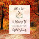 Um poster de boas-vindas para um chá de panela elegante e moderno. Um fundo cor-de-rosa pincelado e rosa dourado, uma abóbora creme e flores. Texto: Apaixonem-se, bem-vindos. Texto castanho.