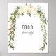 Sinal de mesa de comida para seus convidados para o chá de aspersão de bebê. spray floral de rosa branca elegante com fundo branco.