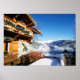 28" x 20", Poster de valor (Matte). Belo chalé suíço cercado por neve profunda. Montanha com capas de neve na frente.