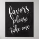 Uma elegante placa de casamento de vanguarda, mostra o texto "Favores, por favor, peguem um" em uma letra extrovertida, a textura do pincel adiciona um sentimento espontâneo e brincalhão. A cor de fundo pode ser personalizada de acordo com as suas necessidades e preferências, contacte-me se tiver alguma solicitação especial.