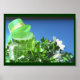 Esta foto foi tirada com um fundo azul. A cerveja verde e o chapéu verde representam Ruas. Dia dos Patricks. Folhas de trevos e folhas estão em volta da cerveja. Esta foto pode ser feita em qualquer tamanho. Adicione um quadro a esta foto.