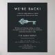 Anuncie sua reabertura comercial à comunidade com este poster moderno e elegante que é perfeito para corretores imobiliários, corretores imobiliários e empresas de gerenciamento de propriedades. Design moderno apresenta letras brancas em um fundo preto suave, adornado com uma ilustração de chave do esqueleto estilo vintage em folha aqua faux. Personalize com cinco campos de texto modelo para o título, texto do corpo, nome da empresa e informações de contato.