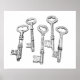 Cartaz com uma ilustração desenhada à mão, em estilo tradicional de caneta e tinta, de uma série de chaves de esqueleto antigas e vintage. Arte: Caneta e tinta sobre papel. Direitos autorais de Dominic A. White. Todos os direitos reservados.