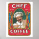 Um anúncio de café art nouveau com um chef sorridente. Uma ilustração elegante, decorativa e colorida para uma cozinha antiga.