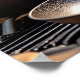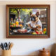 Esta imagem encantadora apresenta um Bulldog Francês branco, preto e marrom, doado com um chapéu de chef branco e uma jaqueta branca com um avental marrom na moda em couro. Com determinação focada, o adorável canino usa espátulas para experientemente sacudir dois bifes de tamanho em uma grade ao ar livre, enquanto uma figura fora de foco funciona no fundo. Legumes e garrafas frescos alinham a mesa, completando esta deliciosa cena de CHURRASCO iluminada por sol.