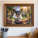 Esta imagem encantadora apresenta um Bulldog Francês preto e branco, esportando um chapéu e avental de chef branco e nítido, grelhando diligentemente um bife de tamanho ao ar livre. Com uma expressão focada e um utensílio de faca/garfo na pata, o adorável cozinheiro canino tende à carne sobre os brilhos, enquanto a luz do sol quente banha a cena. Garrafas e guarnições são visíveis na mesa rústica, criando uma atmosfera convidativa de CHURRASCO de quintal.