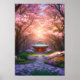 Uma vista serena e pacífica de um pequeno santuário japonês aninhado entre lindas árvores cerejeiras floridas. Um caminho de pedra leva até o santuário, e flores coloridas o cercam, somando ao encanto da cena.