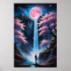 Uma paisagem noturna com uma lua grande, uma cordilheira, árvores floridas de cereja rosa, uma cachoeira, e uma pessoa na base da cascata olhando para o céu cheia de estrelas e planetas.