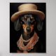 Retrato de um dachshund super elegante com um chapéu de creme de rico, cachecol rosa e pérolas