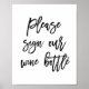 Sinal moderno e chic que diz "Por favor assine nossa garrafa de vinho" em um belo roteiro de pincel.