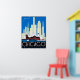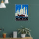Um horizonte vintage de Chicago numa poster de reprodução restaurada. Edifícios estilizados ao fundo e bandeira americana acenando sobre Fort Dearborn. Aviões imaginários em cima.