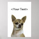 Um chihuahua com pelo castanho claro, olhos chatos, e uma atitude.
