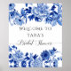 "Placa de Chá de Noiva em estilo Chinoiserie azul e branco. Desenho em estilo Chinoiserie chinês em azul-marinho, azul e branco tem interpretações estilizadas de flores, folhagens, galhos de árvores e um pássaro canoro que enquadra o texto para dar as boas-vindas aos seus convidados para o Chá de Noiva da noiva. A obra de arte foi pintada por Audrey Jeanne Roberts, uma artista e designer licenciada internacionalmente, direitos autorais reservados.
