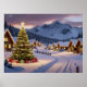 Serene Christmas holiday landscape scene with decorated Christmas tree in the midst of a village in early evening.