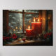 Lovely watercolor, Winter window with lit, glowing red candles, holly berries, pine cones, Red Poinsettia flower on a holiday window sill.
