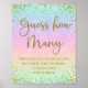 Chuva de cores adivinhe quantos jogo para chá de bebê sinal com fundo de glitter dourado e arco-íris pastel. Basta adicionar o texto de sua escolha no estilo de fonte e cor que preferir. Esses lindos sinais de jogo para chá de bebê em arco-íris e dourado ficam ótimos em uma moldura decorativa sobre a mesa do seu evento.