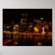 Uma fotografia do horizonte de Pittsburgh à noite. O céu é preto sólido e as luzes de ouro brilham dos edifícios, refletindo fora da água do rio. Esta foto foi tirada do topo do Monte Washington durante o verão.