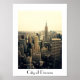 Nova Iorque é a cidade onde os sonhos se tornam realidade para tantas pessoas. Esta foto mostra uma vista do horizonte de Nova Iorque de cima com o Empire State Building como peça central. O texto diz: Cidade dos Sonhos. Aproveite este poster/impressão como está ou personalize-o usando o 'botão personalizar' para colocar seu próprio ditado ou memória neste lindo poster/impressão. Tudo é personalizável neste poster/impressão: o texto, o posicionamento do texto, o tamanho da fonte, a cor do fundo, a fonte, etc...