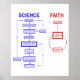 Um diagrama ilustrando os diferentes processos de pensamento por trás da ciência e da fé. Quando se descobrem novas evidências, a ciência testa-as contra teorias existentes e modifica a teoria para melhor compreender o Universo. A religião ignora evidências contraditórias num círculo infinito de ignorância.